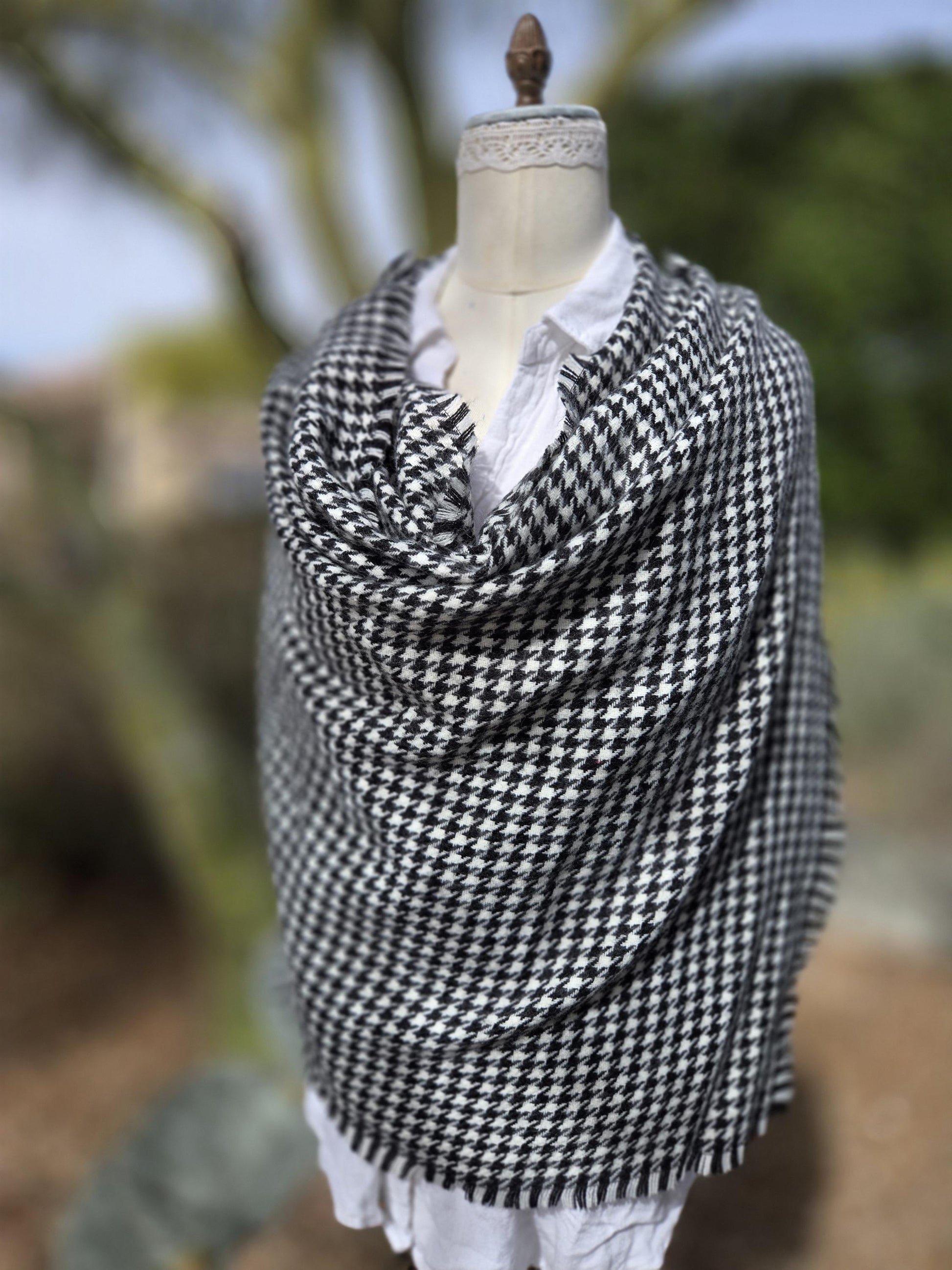 This vintage houndstooth shawl is soooo soft!! it is about 71"x23" ...so it can be used as a scarf or wrap!! Super warm, it's a classic!! The perfect gift for yourself or a loved one!! Wrap em' up in soft, cozy squish!!